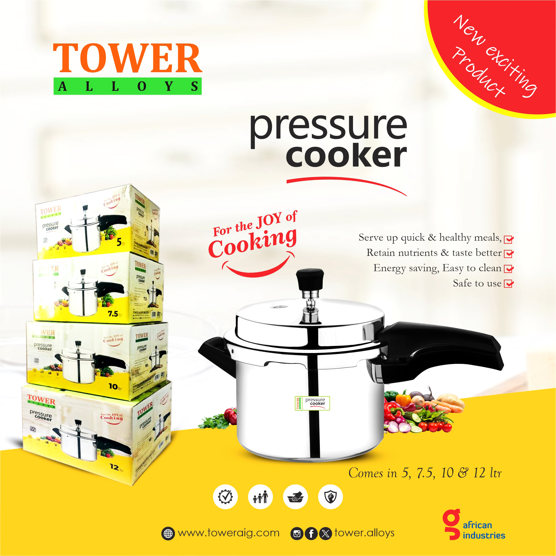 Tower Pressure Cooker Pot Set – is a premium cookware that make kitchen standout with its great polished finishes, and well designed for comfort and efficiency. Crafted from durable Aluminum, each pot is designed to deliver fast, even cooking with advanced pressure technology that cuts cooking times significantly while locking in nutrients and flavors. The set features a secure locking lid, an intuitive pressure indicator, and multiple safety mechanisms to ensure a worry-free cooking experience. Perfect for soups, stews, grains, and more, Tower Pressure Cooker Pot Set is an essential addition to any kitchen.