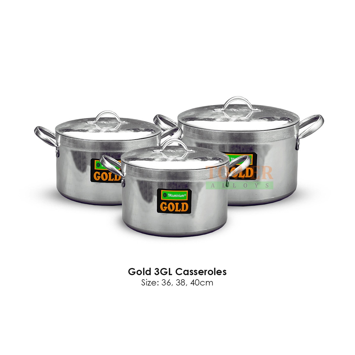 Gold 3GBL – is a premium cookware that make kitchen standout with its great polished finishes, and well designed for comfort and efficiency, ergonomic stainless-steel handle for easy handling; comes in three (3) large sizes that take care of cooking needs; made from pure grade strong and durable aluminum, very easy to wash and clean after use; remains rust-free for longer usage. Gold 3GBL can serve as a gift and a great ideal for family cooking.